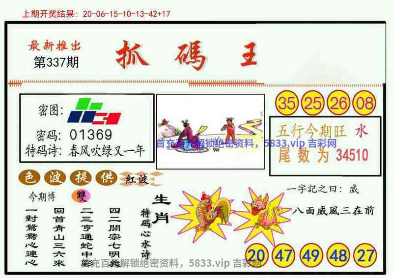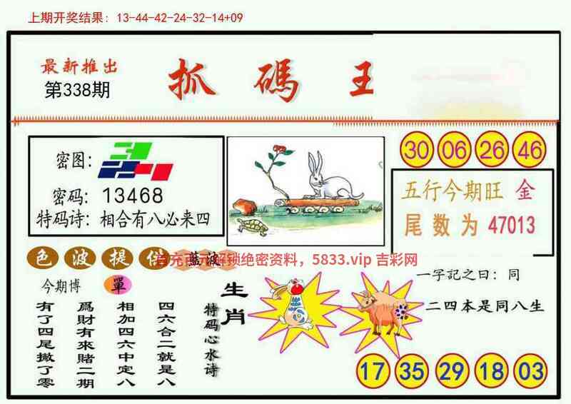 【精解抓码王】开(發00) 339期:藏身乱石涧泥坡 【主攻抓肖】鼠马鸡羊兔狗龙牛猴 【抓码尾数】12368 【抓码双波】绿红波 【主攻抓码】06.18.24.21.23.03.32.02.29.46 |